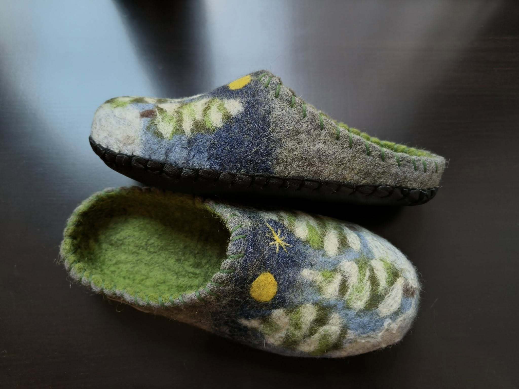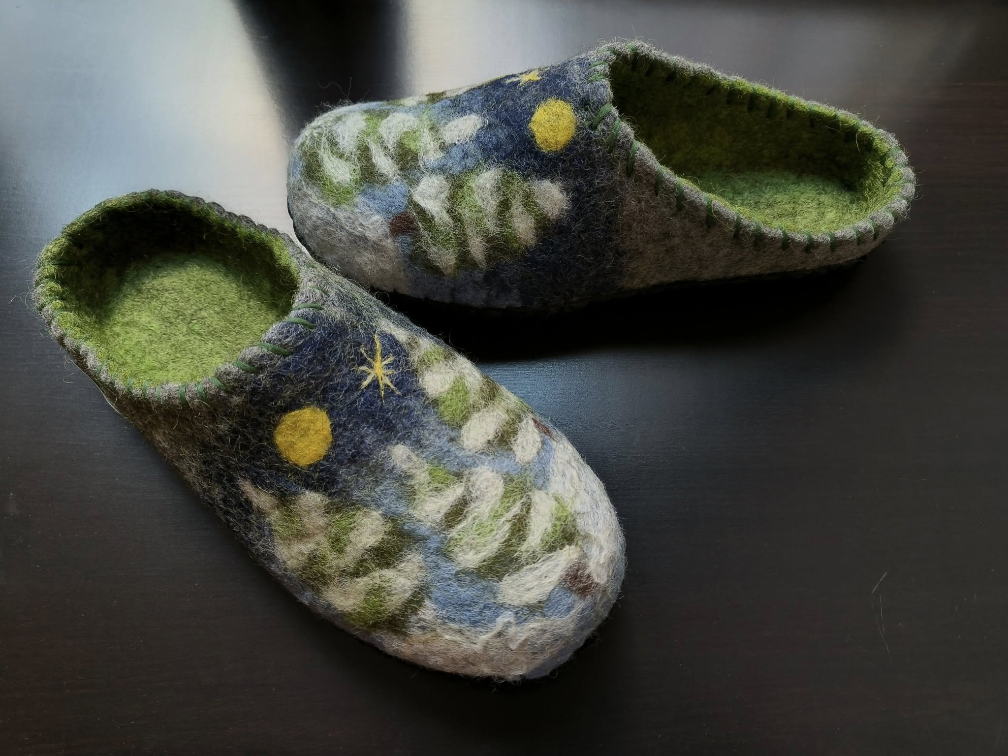 Kauniit 100 % villasta Virossa käsityönä huovutetut tossut.